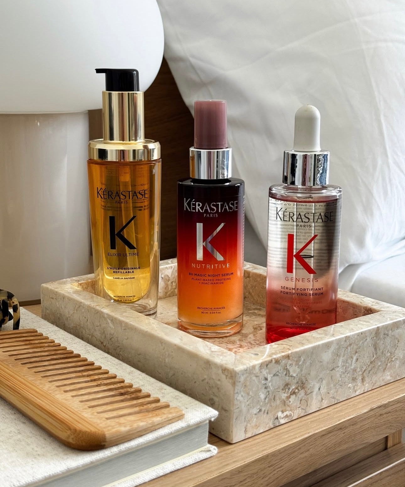- Aplica Kérastase Sérum Nutritive 8H Magic Night para hidratar y suavizar durante la noche.