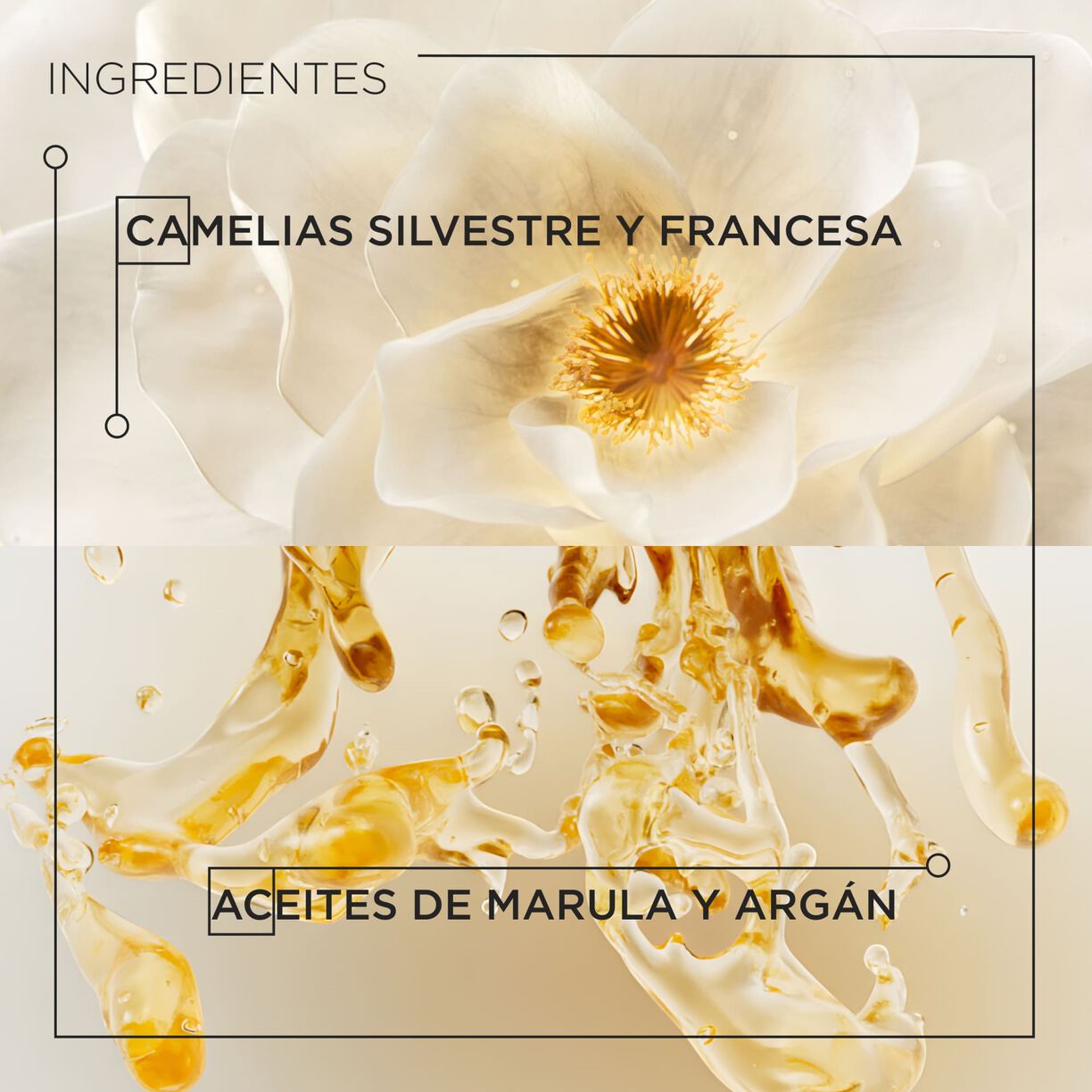 - Aceite de camelia francesa: Recolectado a mano en Bretaña y extraído en frío para preservar sus propiedades nutritivas, iluminadoras y emolientes.
