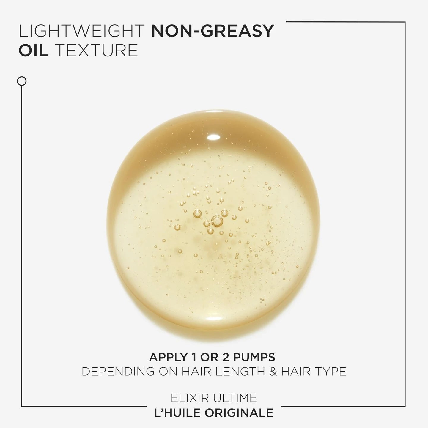 Elixir Ultime L’Huile Original (30ml) – Aceite capilar hidratante y recargable para todo tipo de cabello, enriquecido con camelia silvestre. Proporciona un brillo intenso, controla el frizz, fortalece la fibra capilar y protege del calor hasta 232°C (450°F).